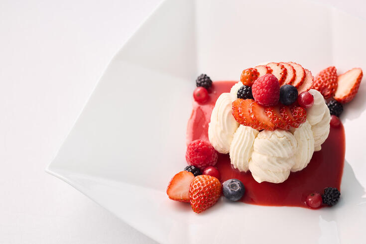 【DESSERT】 Paul Bocuse’s special crème brûlée or Orange cake with fromage blanc ice cream or (+¥880)Vacherin Glacé with Strawberries and Red Fruits