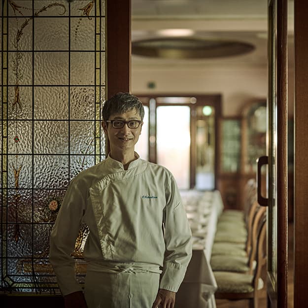 1991年にひらまつの門を叩き、当時西麻布にあった「ヴィノッキオ」にて、料理長 阿曽達治のもと料理人としての道を歩むことに。「リストランテASO」の開業にも尽力し、同じ厨房で多くの時間を過ごした阿曽から学んだのは、どんな時も心を尽くしてお客様をお迎えする“誠実さ”。情熱を内に秘めた温厚篤実な人柄で、自身が培ったすべての要素からロジカルに生み出されるレシピは、緻密なバランスで仕立てられ、実にエレガント。「食事を終えた時、幸せな気持ちに包まれるレストラン」を信条に、日々料理を通じてお客様へ幸せをお届けします。