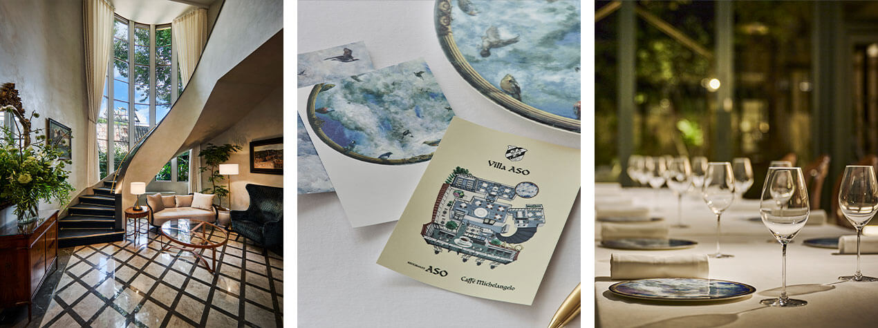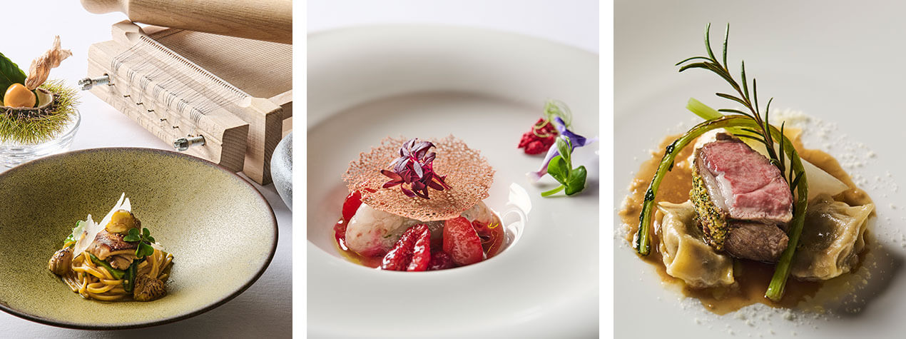 「五感で愉しめる」、「遊び心がある」と評されるリストランテASOの料理。その食材へのこだわりも、独創的な演出も、すべては、「よりおいしい一皿を」という想いに誠実に向き合うことから生まれています。世代を超えて受け継がれてきたクラシカルな洋館の雰囲気と、一皿一皿が調和して生み出す記憶に深く残る食体験を、ぜひご堪能ください。