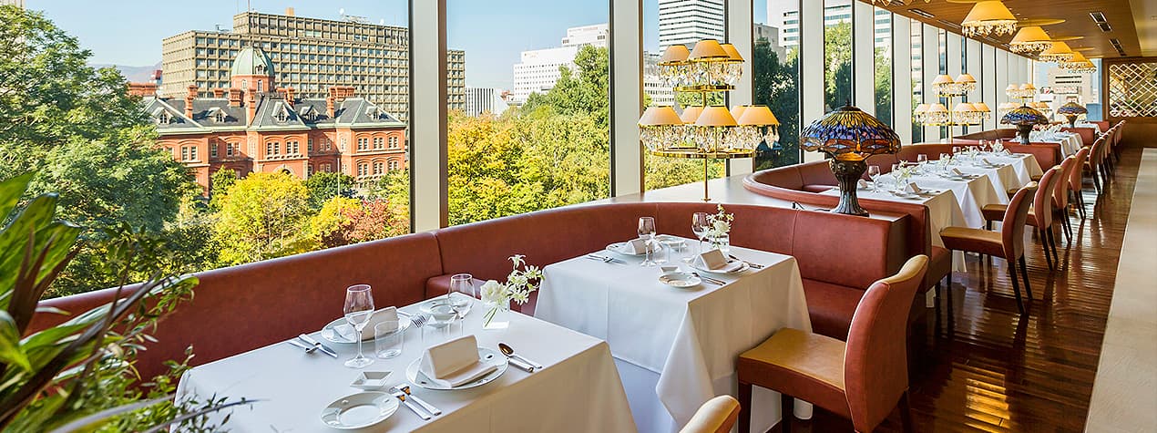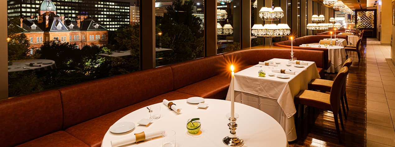 赤れんが テラス4階にレストランを構え、西側一面が大きな窓になっている解放感溢れる造り。メインダイニングはすべて窓際席という贅沢な配置で、国指定重要文化財である赤れんが庁舎や銀杏並木を見渡すことができます。桜、新緑、紅葉、雪景色と移り変わる景観は、まるで絵画のような息を呑む荘厳さ。昼は、優しい自然光が降り注ぎ、夜はキャンドルが揺れ、非日常を演出します。サロンと3つの個室を備えますので、記念日をはじめ、接待やお子さま連れの会食にもぜひ。札幌駅から徒歩5分。地下歩行空間から繋がっている好立地も魅力です。