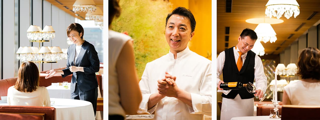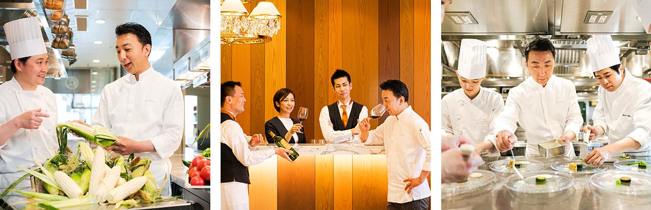 厨房スタッフもサービススタッフもチーム一丸となり、最高の状態で「レストランMINAMI」の料理をお客様のテーブルにお届けします。それは、スタッフ全員が、料理長南の生み出す料理を心から敬愛し、誇りに想っているからこそ。ひらまつらしい洗練されたホスピタリティのなかにも、人柄が表れるような心の通った会話を大切にすることで、お客様とスタッフが自然と笑い合えるようなレストランに。「元気な笑顔を見に行くわ」とお客様に仰っていただけることも、スタッフ一同の喜びです。食事をするというほんのひとときが、思い出深いものとなることを願っています。